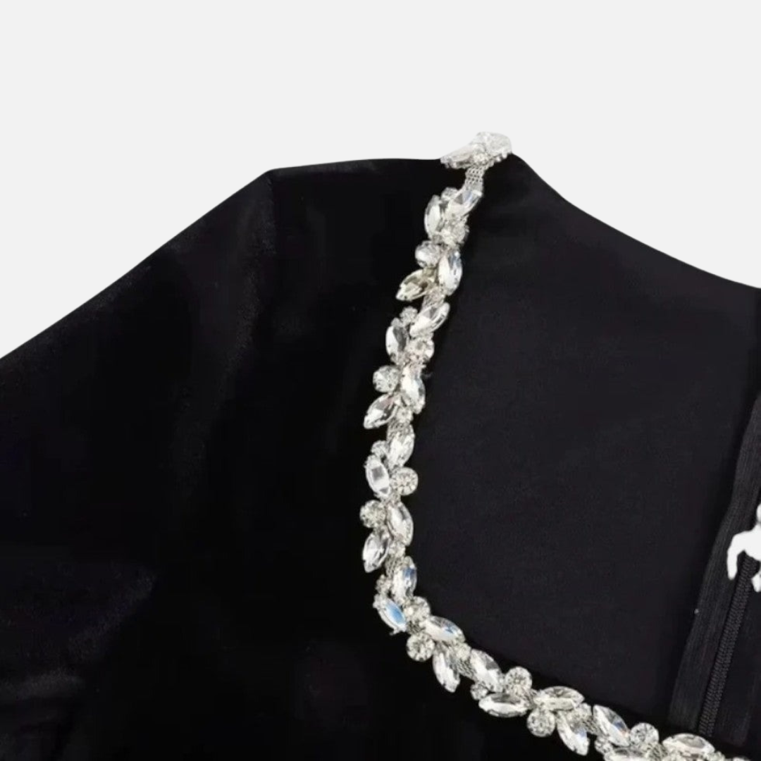 Step into sophistication with this velvet mini dress featuring a flattering A-line silhouette, long sleeves, and a beautifully embellished floral neckline. Soft, luxurious, and perfect for evening events, holiday parties, and romantic nights out. A timeless blend of elegance and style.