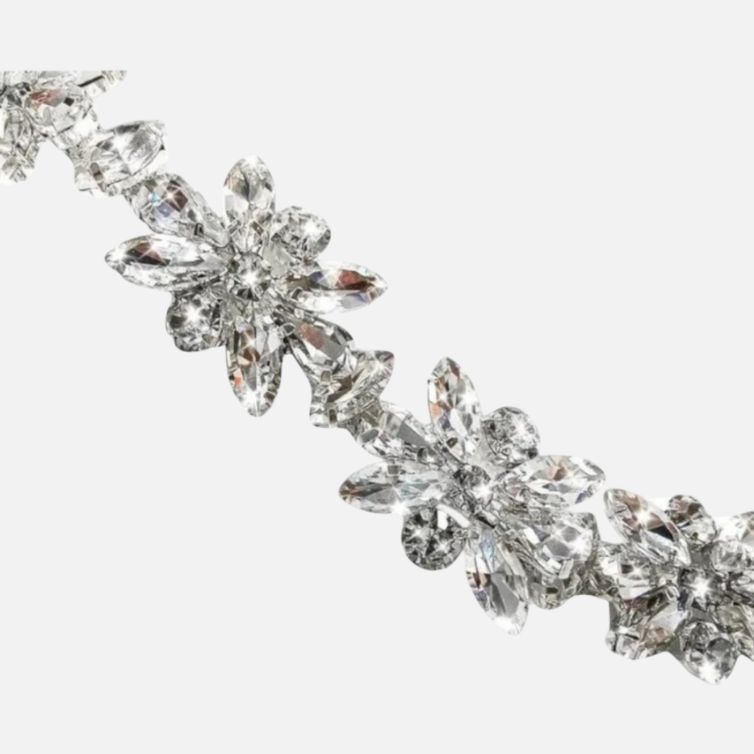 Floral embellished neckline adds a feminine, eye-catching accent